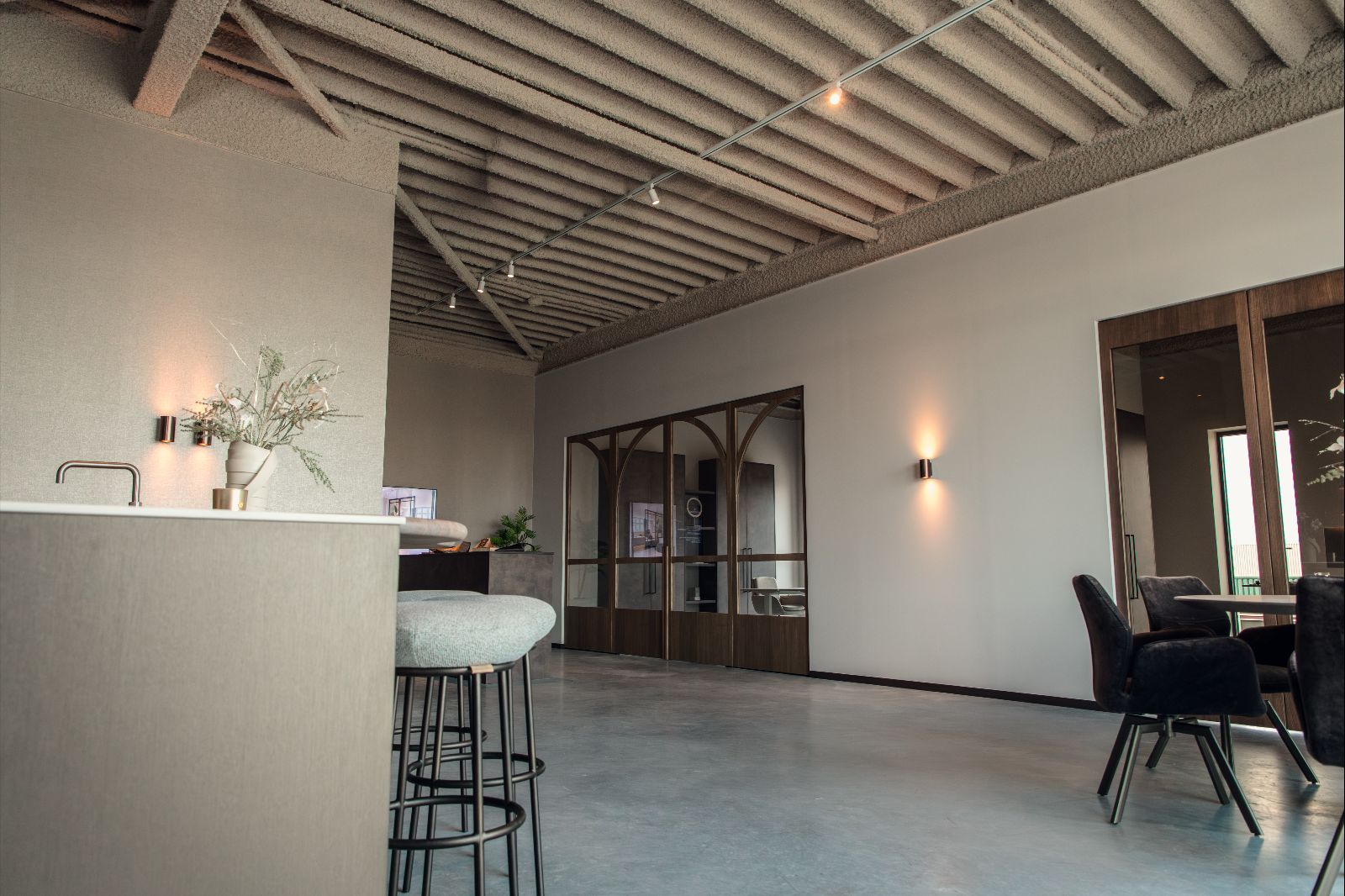 Akoestiek creëren met het behoud van een warme sfeer. In de showroom en het kantoor van Wooddoor was één ding direct duidelijk: een standaard systeemplafond kwam er niet in. Het team van Ecoustics realiseerde in slechts 2 dagen een akoestisch spuitplafond over 239 m², inclusief zorgvuldig meeverfde plinten. De eigenaar had daarnaast zelf een plint op kleur laten coaten en gemonteerd, wat het geheel een perfect afgewerkte uitstraling geeft.