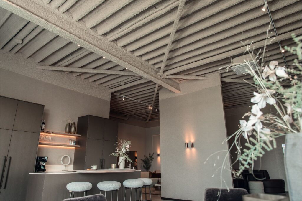 Het spuitplafond biedt de ideale oplossing om de ruimte open en hoog te houden en de akoestiek te verbeteren. Daarbij speelde de kleurkeuze een belangrijke rol. De specifieke beige kleur zorgt voor een warme, uitnodigende sfeer die meteen opvalt bij binnenkomst.